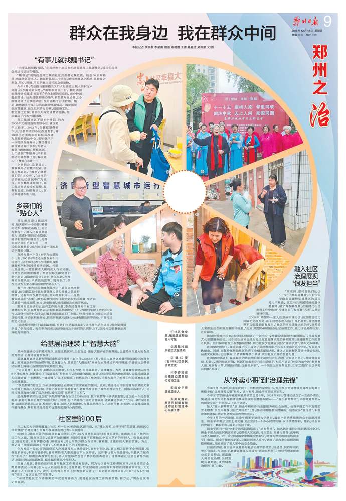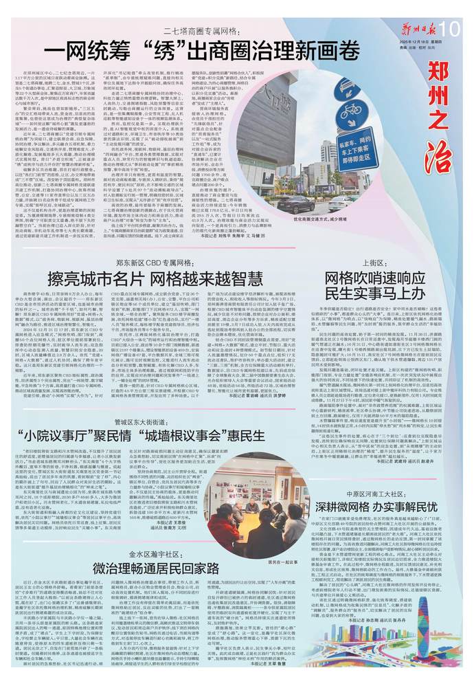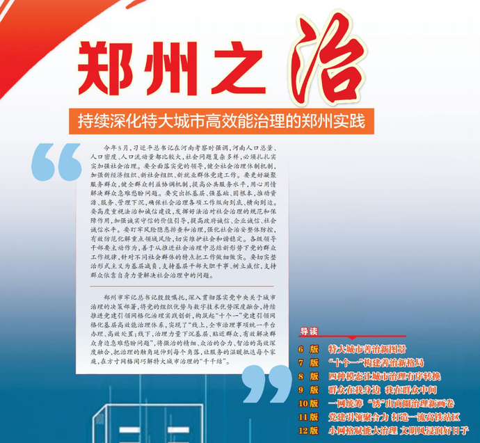 鄭州市牢記總書記殷殷囑托,深入貫徹落實黨中央關于城市治理的決策部署,將黨的組織優勢與數字技術優勢深度融合,持續推進黨建引領網格化治理實踐創新,構筑起“十個一”黨建引領網格化基層高效能治理體系,實現了“線上,全市治理事項統一平臺辦理、高效處置;線下,治理力量下沉基層、貼近群眾,有效解決群眾身邊急難愁盼問題”,將微治的精細、眾治的合力、智治的高效深度融合,把治理的觸角延伸到每個角落,讓服務的溫暖抵達每個家庭,在方寸網格間巧解特大城市治理的“千千結”。”