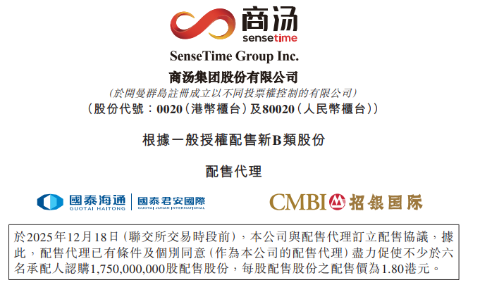 【大河財立方消息】12月18日早間,商湯在港交所公告,與配售代理訂立配售協議。據此,配售代理已有條件及個別同意盡力促使不少于六名承配人認購17.5億股配售股份,配售價為1.80港元/股。配售價較12月17日收盤價折讓約8.63%。