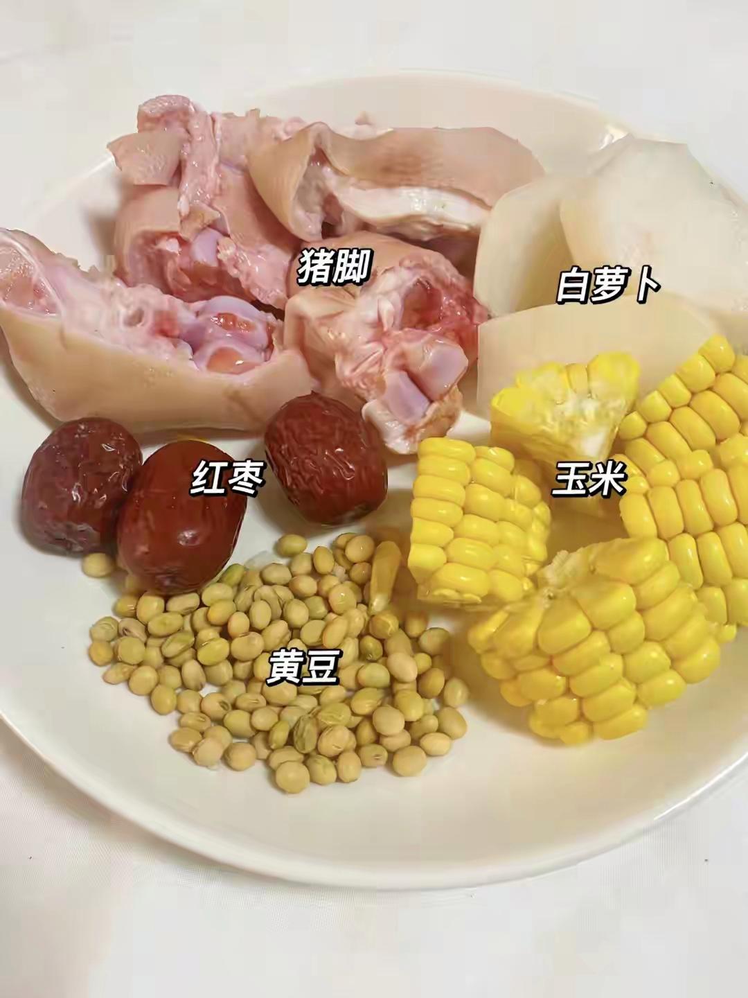 1. 豬蹄處理同上,焯水洗凈。泡好的黃豆準備一小碗。白蘿卜半根切滾刀塊。