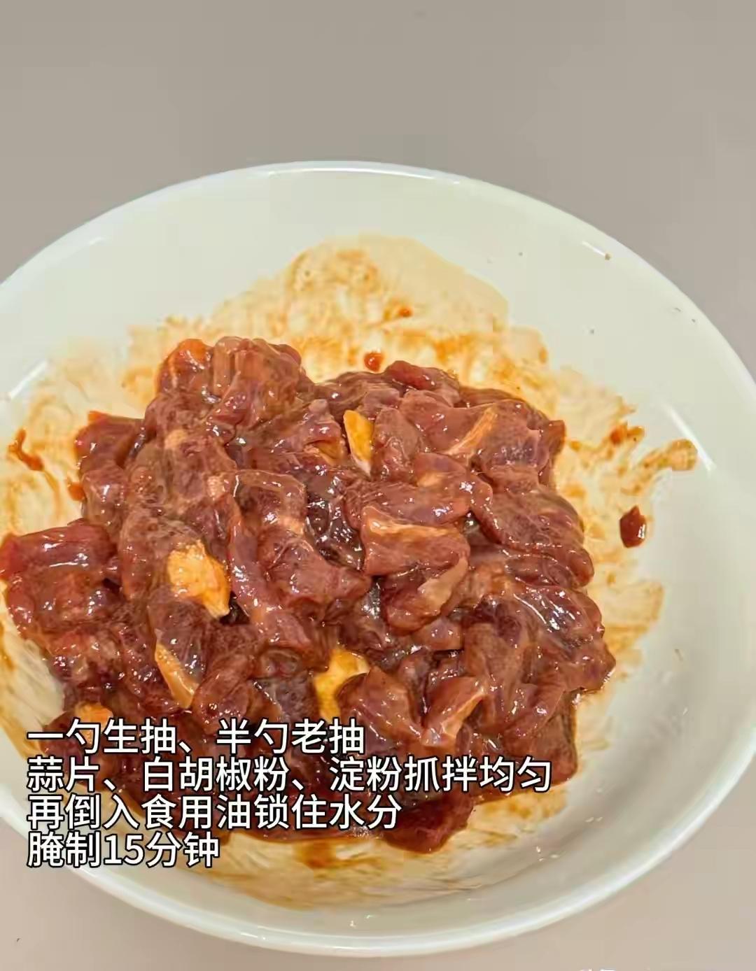 2. 牛肉逆著紋理切薄片,加生抽、蠔油、一點淀粉和油抓勻,腌10分鐘。