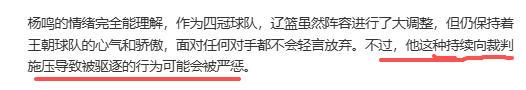 本賽季開始前,中國籃協專門召開職業籃球聯賽警示教育大會,明確要求各俱樂部從嚴管控球員、教練員及隨隊人員言行,特別是要尊重裁判權威。楊鳴如此挑戰裁判權威,恐會遭到追加處罰。
