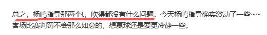 付政浩也痛批楊鳴,他表示“楊鳴在場邊都非常投入,不斷地激勵球員以及向裁判施壓,看得出來他心氣很高?!备墩浦赋觯瑮铠Q上一場比賽也是對裁判不滿,并喊話裁判(原聲被傳出來)。