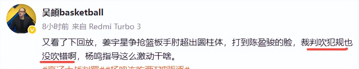 可以說,楊鳴是無理取鬧,輿論幾乎一邊倒地批評楊鳴。媒體人吳頔表示,吹姜宇星犯規沒有錯,他原話是:又看了下回放,姜宇星爭搶籃板手肘超出圓柱體,打到陳盈駿的臉,裁判吹犯規也沒吹錯啊,楊鳴指導這么激動干啥。