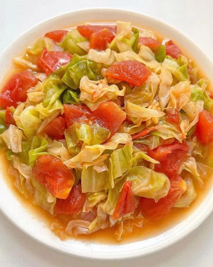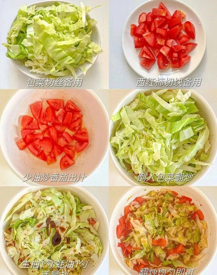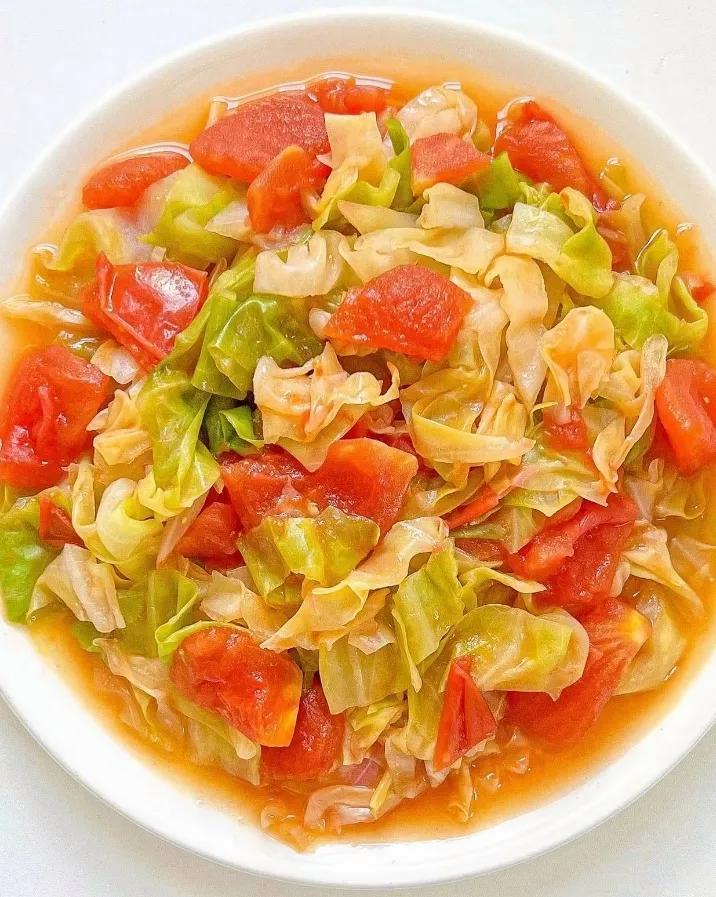 最后來個清爽的——番茄炒包菜。做法最簡單:番茄切塊,包菜撕片;先炒番茄出汁,加糖和鹽調味;倒入包菜翻炒,蓋鍋燜兩分鐘,軟而不爛。出鍋前撒點蔥花,酸甜可口,低卡又營養。