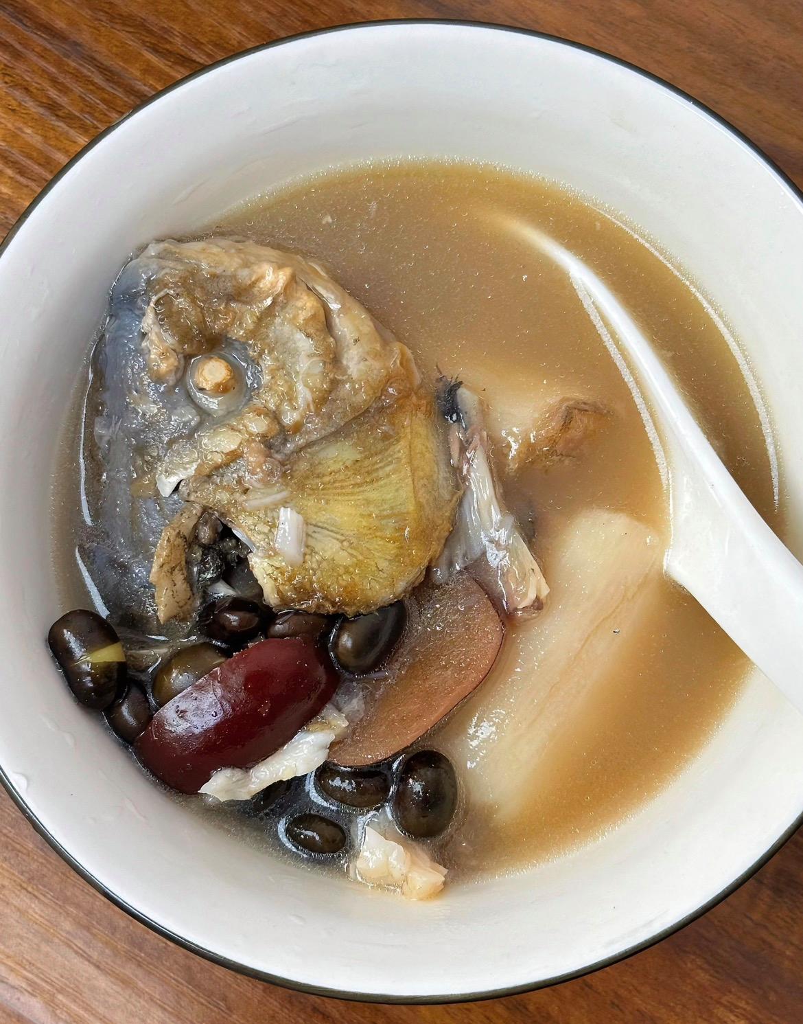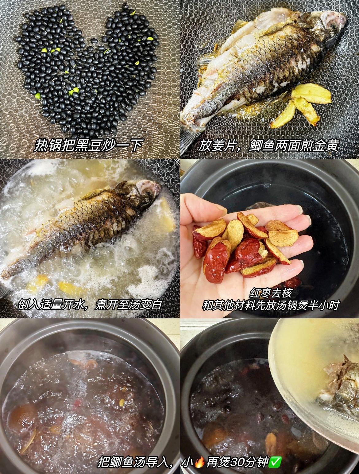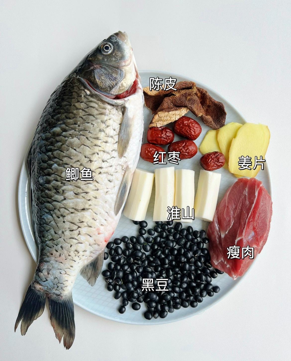 鯽魚 1條、黑豆 50克、瘦肉 150克(可選)、淮山 200克、紅棗 6-8顆、陳皮 1小塊、姜片 4-5片、開水 足量