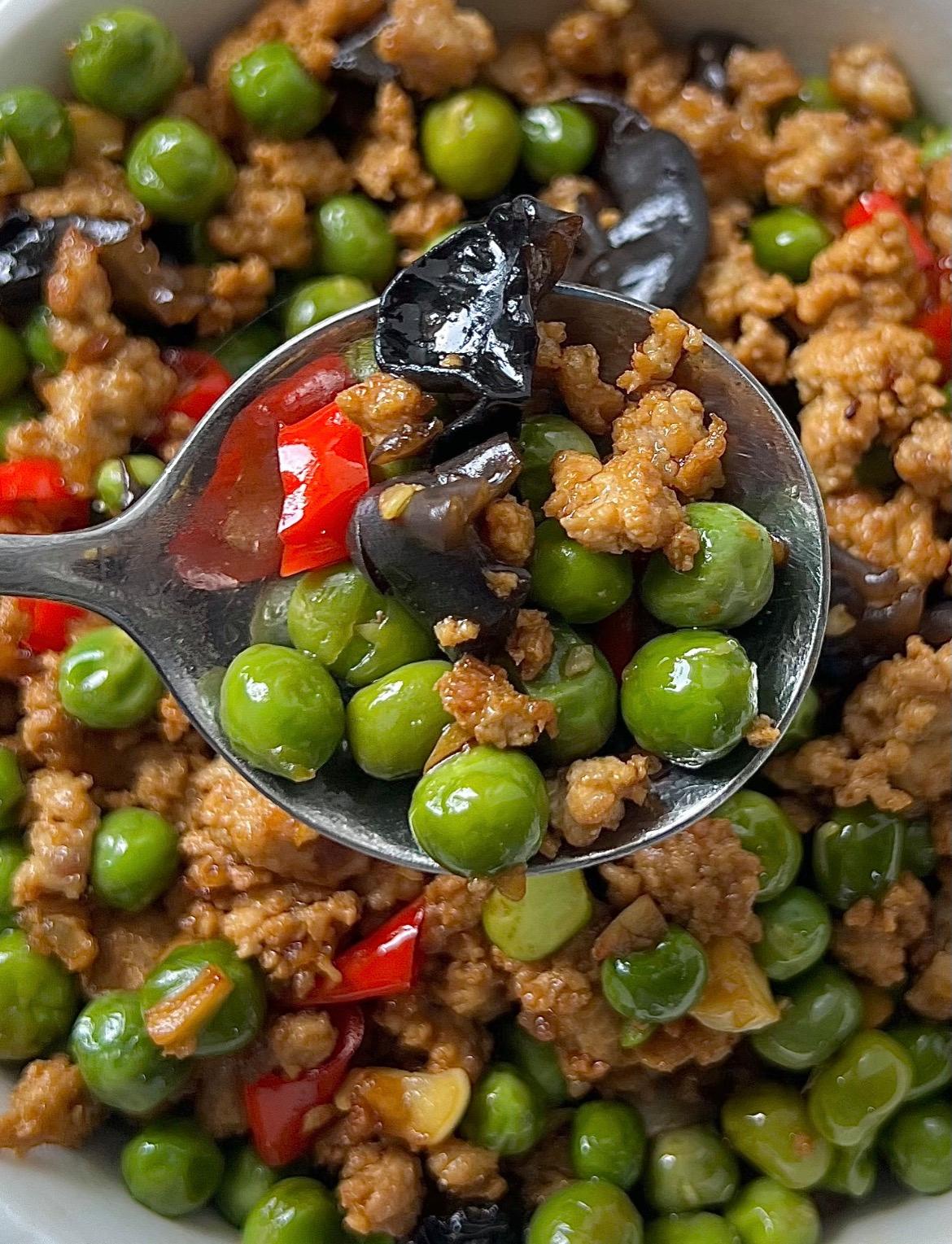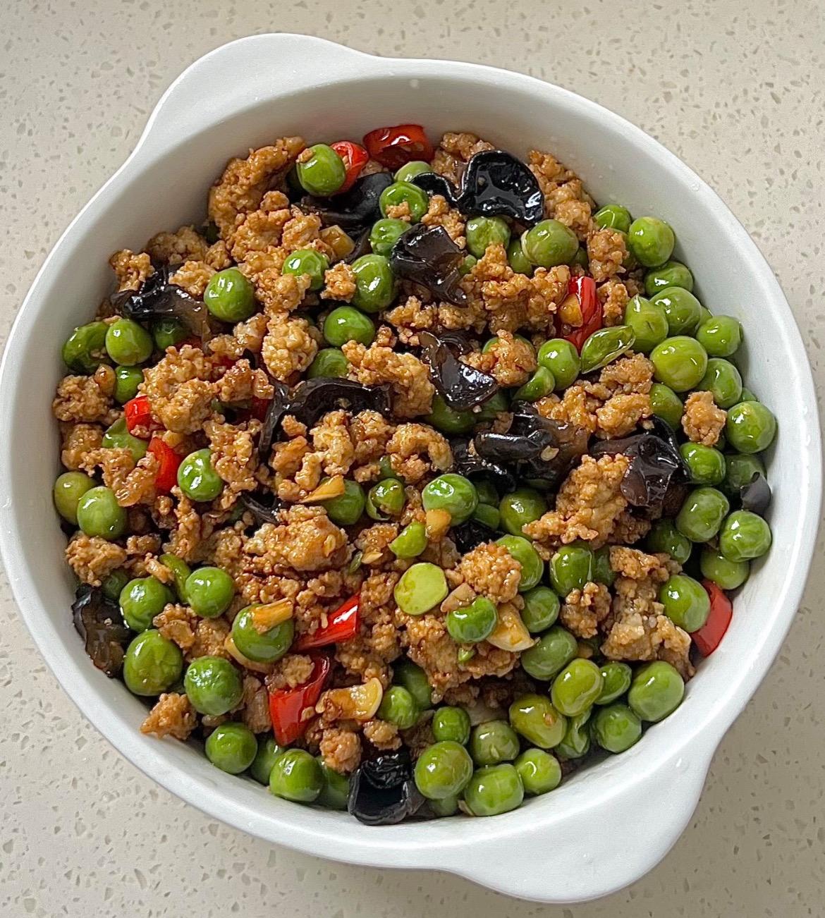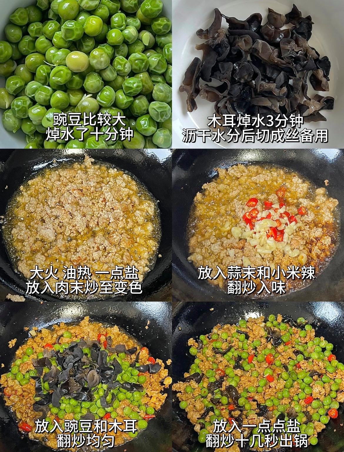豌豆 200克、干木耳 1小把、豬瘦肉末 150克、大蒜 3瓣(切末)、小米辣 2個(切圈,喜辣可多加)、食用油、鹽 適量