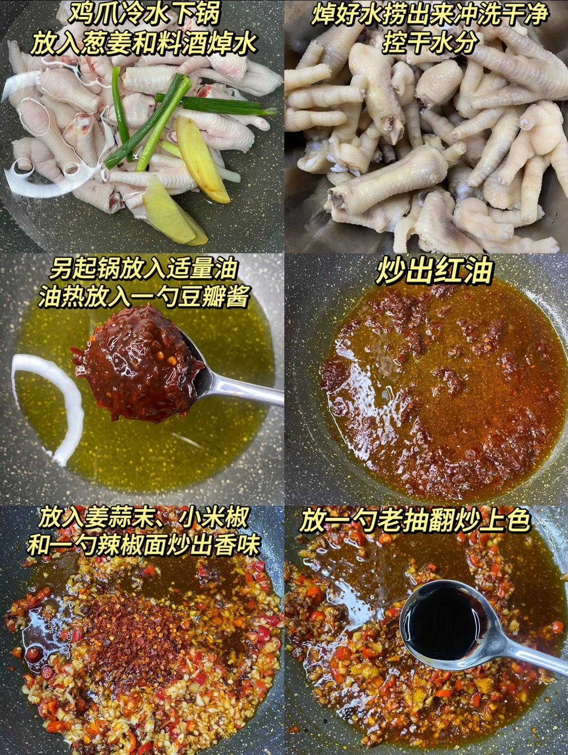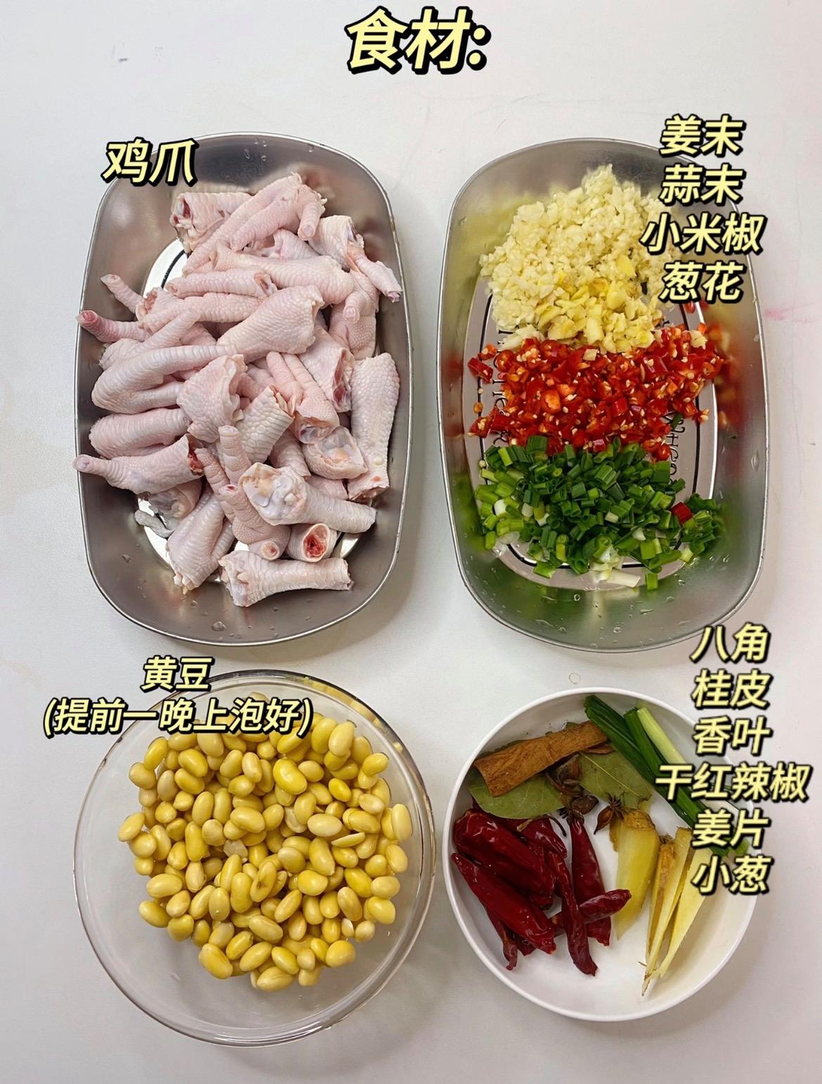 雞爪 500克、黃豆 1小碗、姜片、姜末、蒜末、小米椒、蔥花 適量、八角 2個、桂皮 1小段、香葉 2片、干紅辣椒 4-5個、料酒 1勺、豆瓣醬 1勺、辣椒面 1勺、生抽 2勺、老抽 1勺半、蠔油 小半勺、白糖 少許、胡椒粉 少許、雞精 少許、食用油 適量