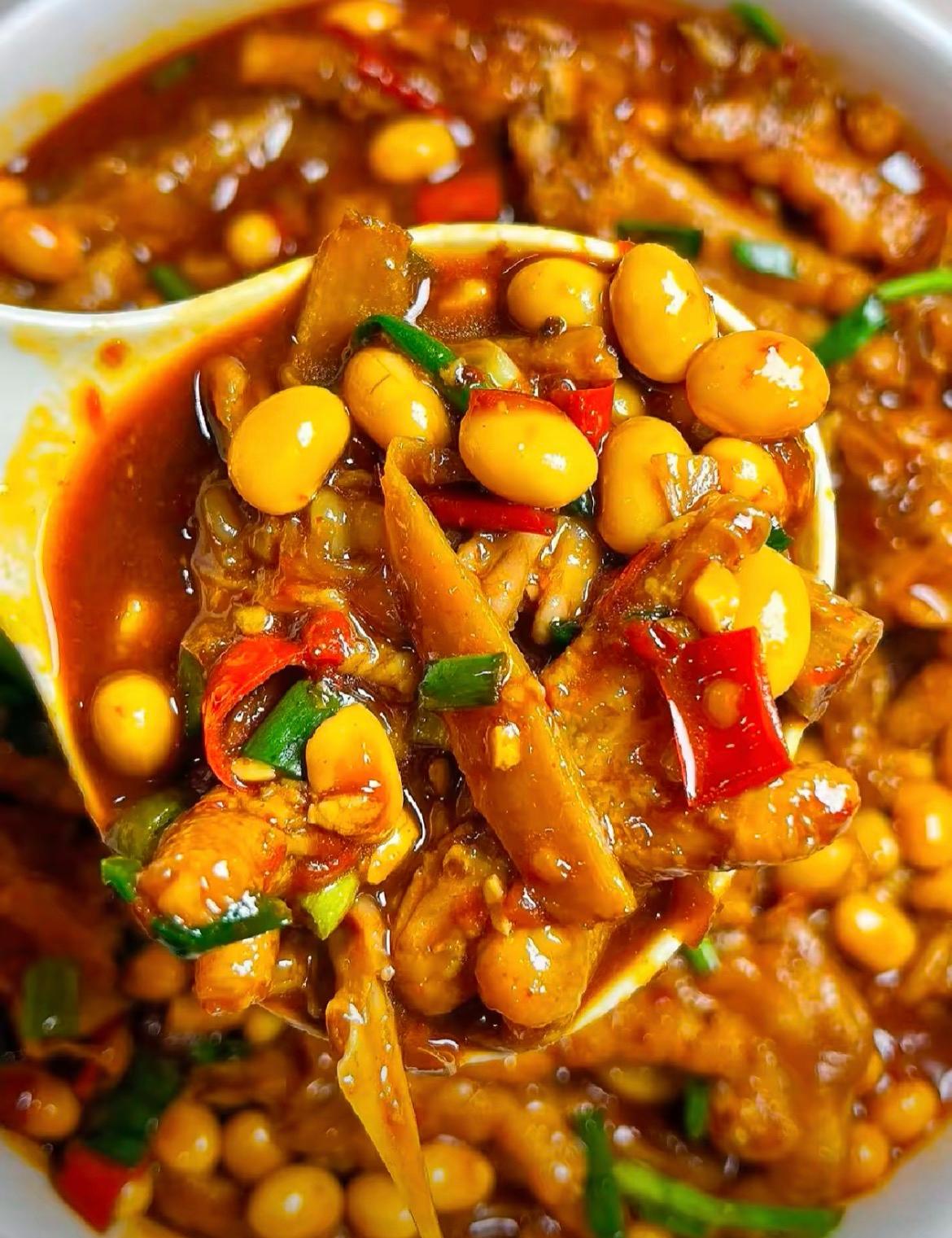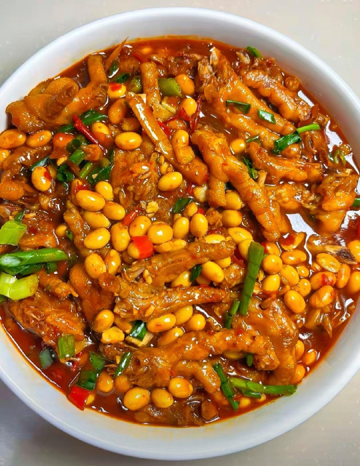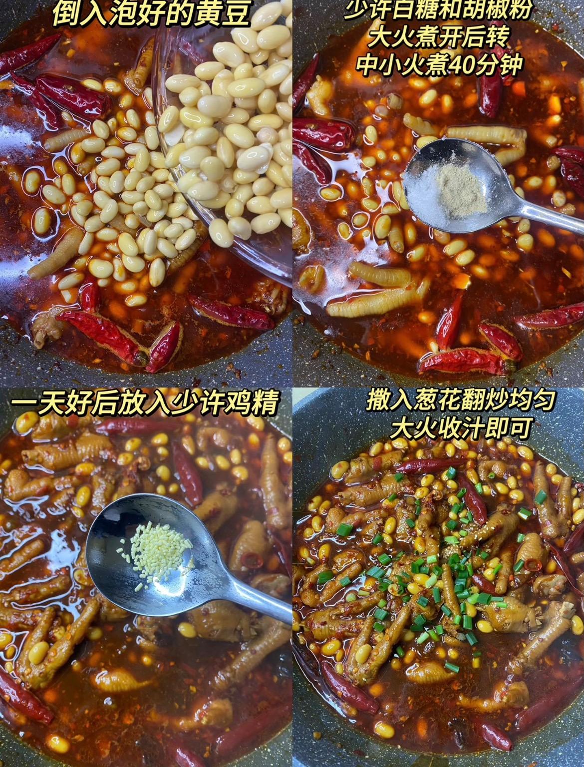 4、煮至雞爪軟糯、黃豆入味后,加入少許雞精,撒上蔥花,轉大火翻炒收汁即可。