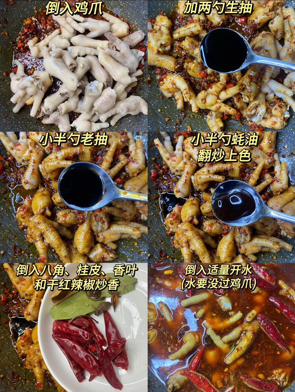 3、放入八角、桂皮、香葉、干紅辣椒,翻炒幾下后倒入適量開水(水量沒過雞爪)。