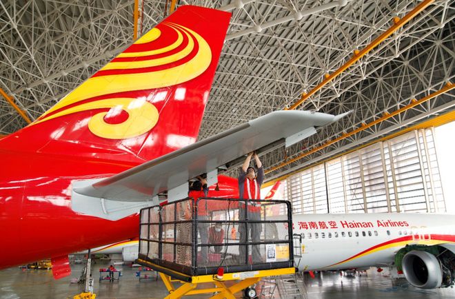 圖:在海南自貿港一站式飛機維修產業基地,海航技術機務正在執行