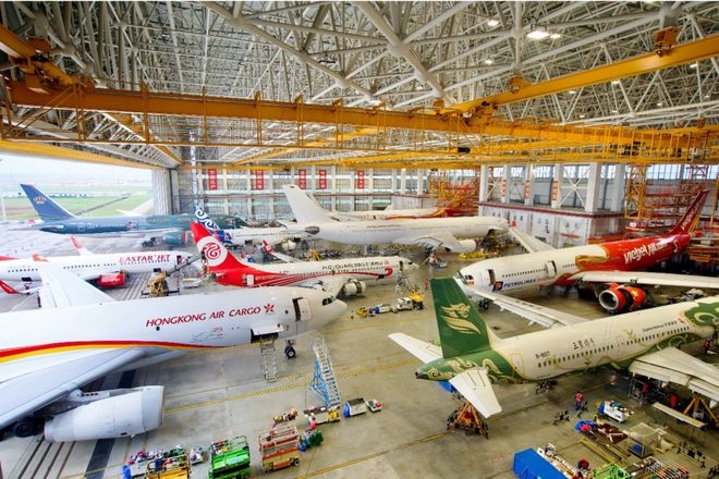 圖:在海南自貿港一站式飛機維修產業基地,來自世界各地的飛機正