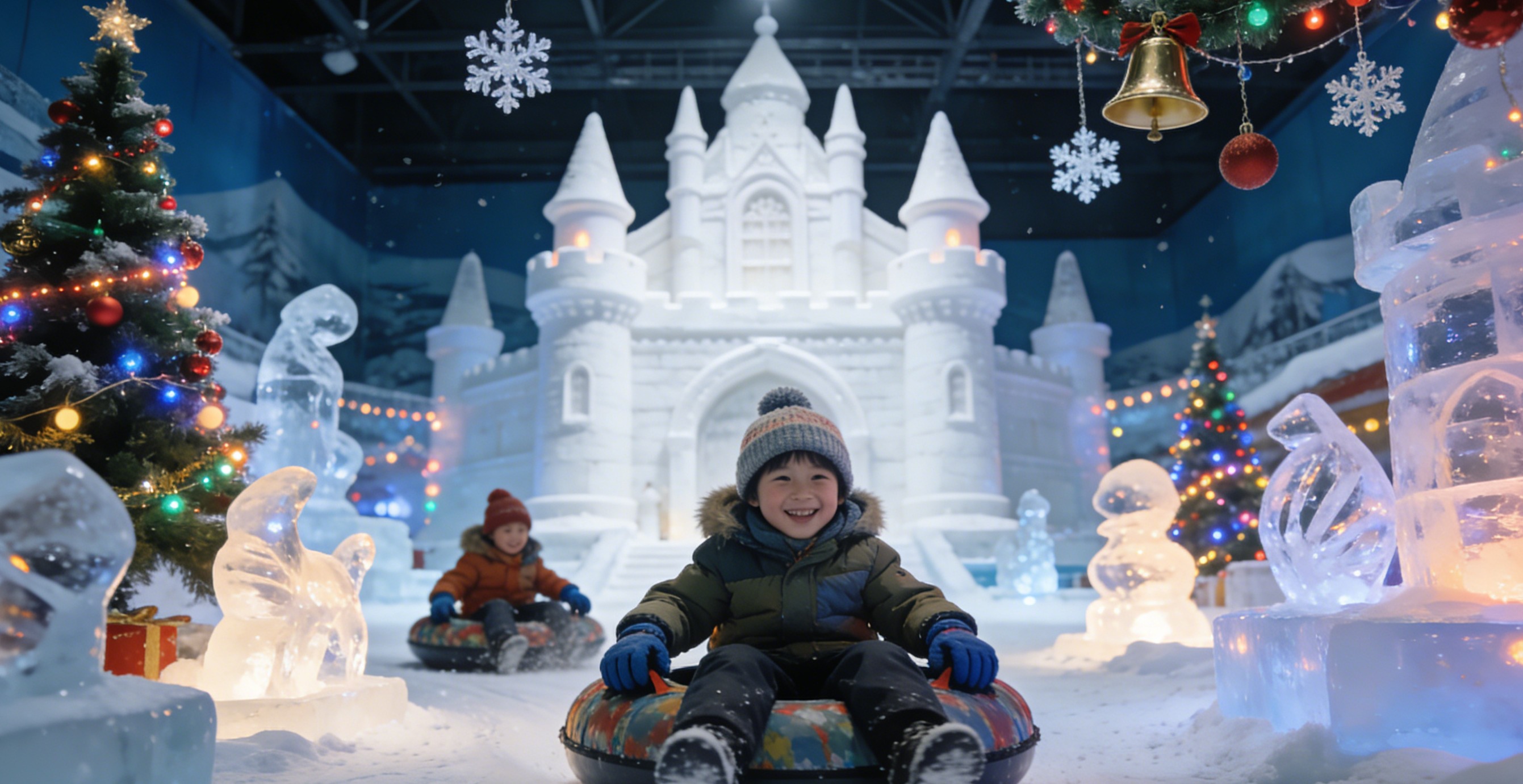 如果是帶娃出行,銀基冰雪世界絕對是不二之選。作為亞洲首個集冰場、娛雪、游樂項目為一體的綜合性冰雪主題親子樂園,這里完全復刻了童話里的冰雪王國,且全程室內恒溫,不用擔心孩子受涼。園區分為圣誕世界、白色城堡、翡翠谷和雪貓小鎮四大主題區域,每一處都充滿故事感:雪貓小鎮的霓虹燈下藏著可愛的雪貓傳說,白色城堡的水晶吊燈閃爍著夢幻光芒,翡翠谷的兩條雪滑道與七條冰滑道則能滿足孩子的嬉雪熱情。