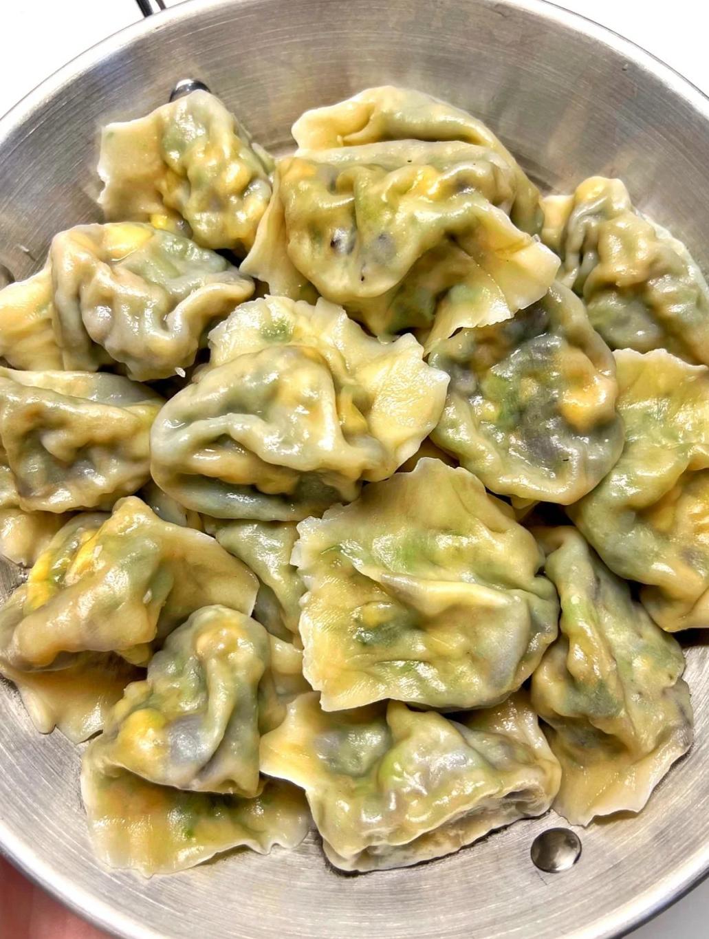 包的時候,皮可以搟得稍薄一些。煮熟后,隱隱透出內里的綠色。
