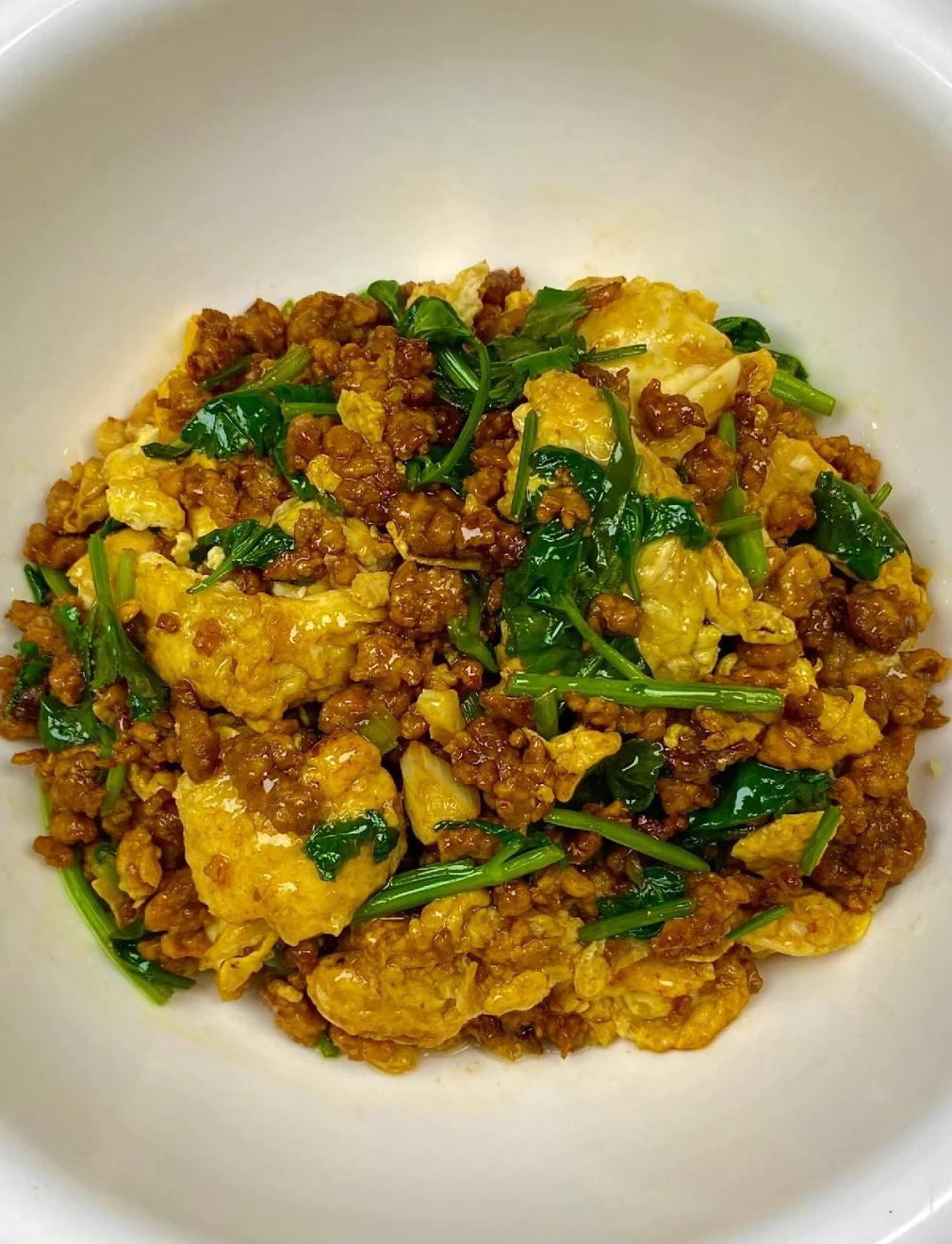 雞蛋的嫩滑,肉末的焦香,香菜的辛烈。三樣再家常不過(guò)的食材,在鍋里一相逢,便勝卻無(wú)數(shù)。它不像大魚(yú)大肉那樣隆重。卻有著抓人的鍋氣和下飯的靈魂。是一道“不知道吃什么時(shí),就吃它”的菜。