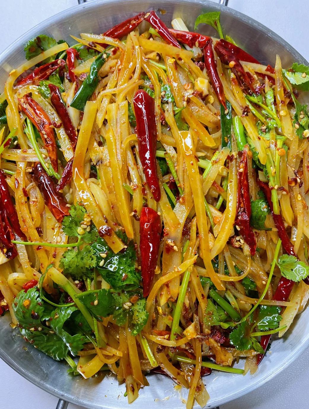 這不僅是涼菜,也可以當(dāng)主食。用來(lái)卷春餅、卷烤鴨,特別解膩。或者,煮一碗清湯面,把這拌好的土豆絲蓋上去,就是一碗風(fēng)味十足的拌面。夏天吃冰爽,冬天吃則有一種刺激食欲的痛快感。