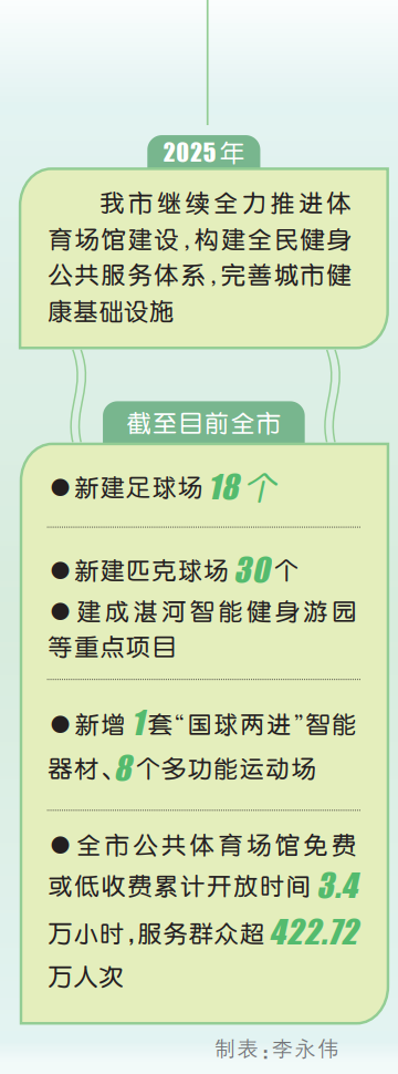 體育事業發展與人民群眾的健康水平息息相關。2025年,我市繼續全力推進體育場館建設,構建全民健身公共服務體系,完善城市健康基礎設施。截至目前,全市新建18個足球場,新建30個匹克球場,建成湛河智能健身游園等重點項目,新增1套“國球兩進”智能器材、8個多功能運動場。全市公共體育場館免費或低收費累計開放時間3.4萬小時,服務群眾超過422.72萬人次。