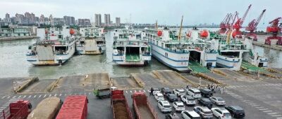 在海南省海口市秀英港,客滾船在裝卸乘客、車輛(無人機照片)。新華社記者 郭程 攝