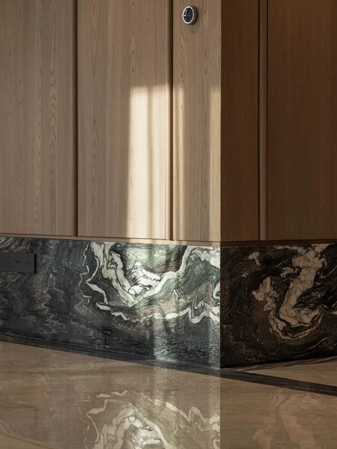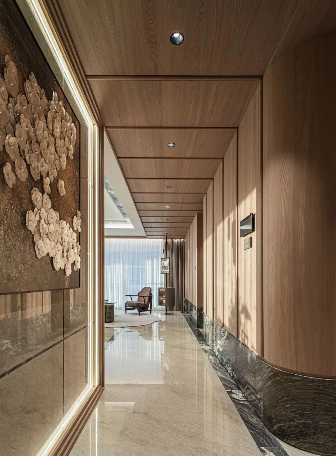 精裝材質秉持長效原則,地面墻面優先選用天然原料,動區過道鋪設質感木飾面提升溫潤感。值得關注的是,項目以45厘米高“石材墻裙”替代傳統踢腳線,既強化墻面防撞保護,又增強空間視覺整體性。
