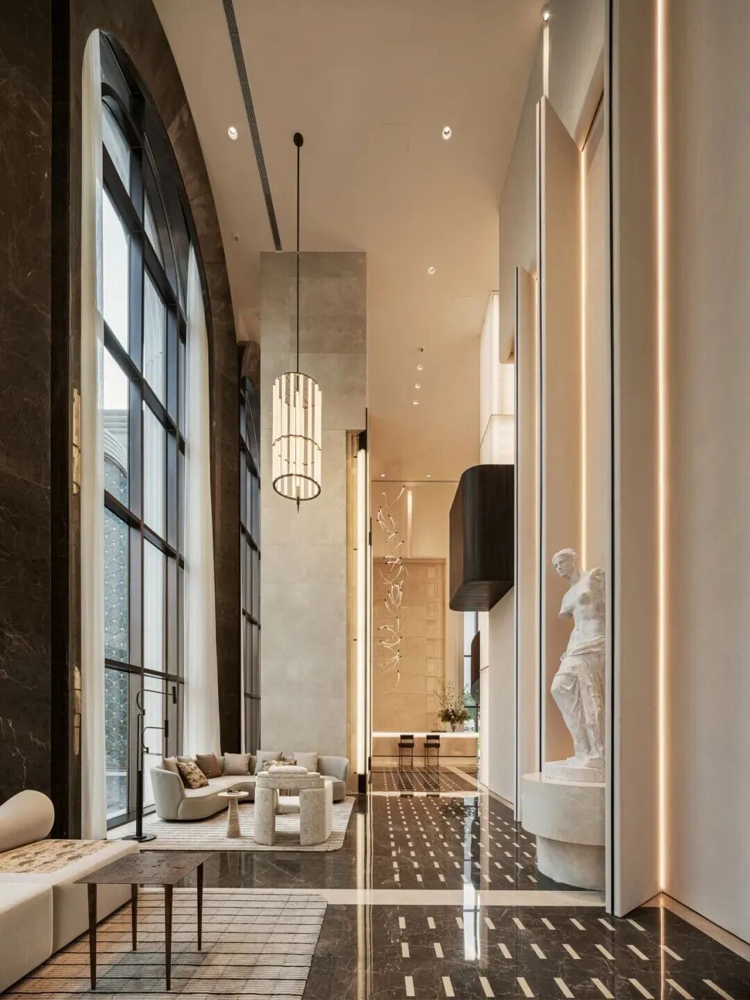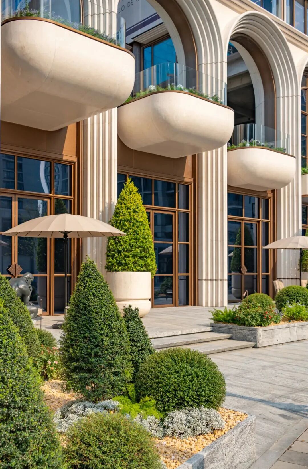 在建筑美學上,詠印明廬充分運用了抬升帶來的空間優勢。入口設計以陣列式拱券構筑起約12米高的宏大門庭,延伸出空中花園挑臺,強化了歸家的儀式感與互動性。
