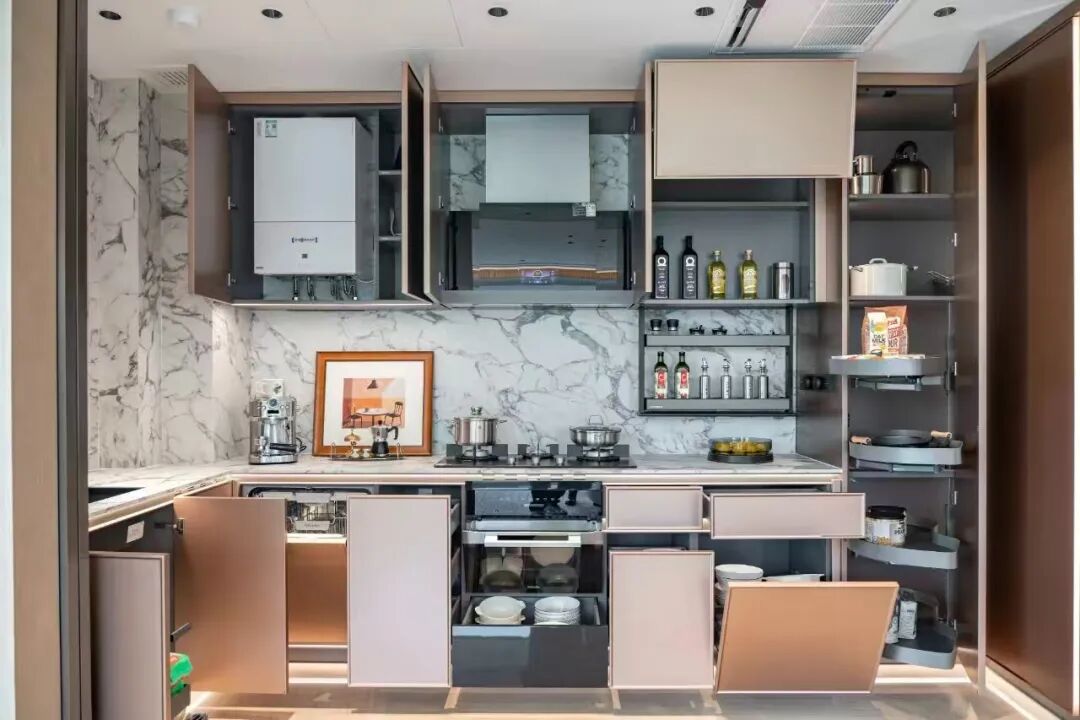 以建筑面積約245㎡展示間為例,廚房完全遵循烹飪動線設計,櫥柜配套電動垂直升降調味籃、輕松抽、飛碟抽及木質折疊電動上翻門等高端五金系統,讓廚具、調料分類收納,取用便捷有序。