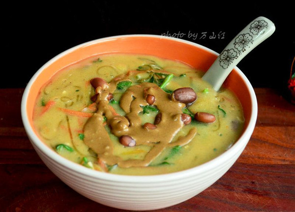 綠豆磨粉,混合著花生、粉條、海帶絲,在大鐵鍋里慢熬成濃稠的糊狀,撒上芝麻、香菜,香氣能飄出半條街。