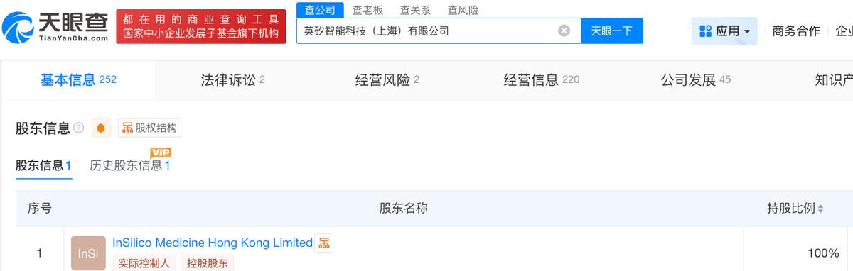 天眼查App信息顯示,英矽智能在境內的主要實體為“英矽智能科技(上海)有限公司”,成立于2019年6月,注冊資本為5600萬美元,法定代表人為Aleksandrs Zavoronkovs,全資股東為InSilico Medicine Hong Kong Limited。