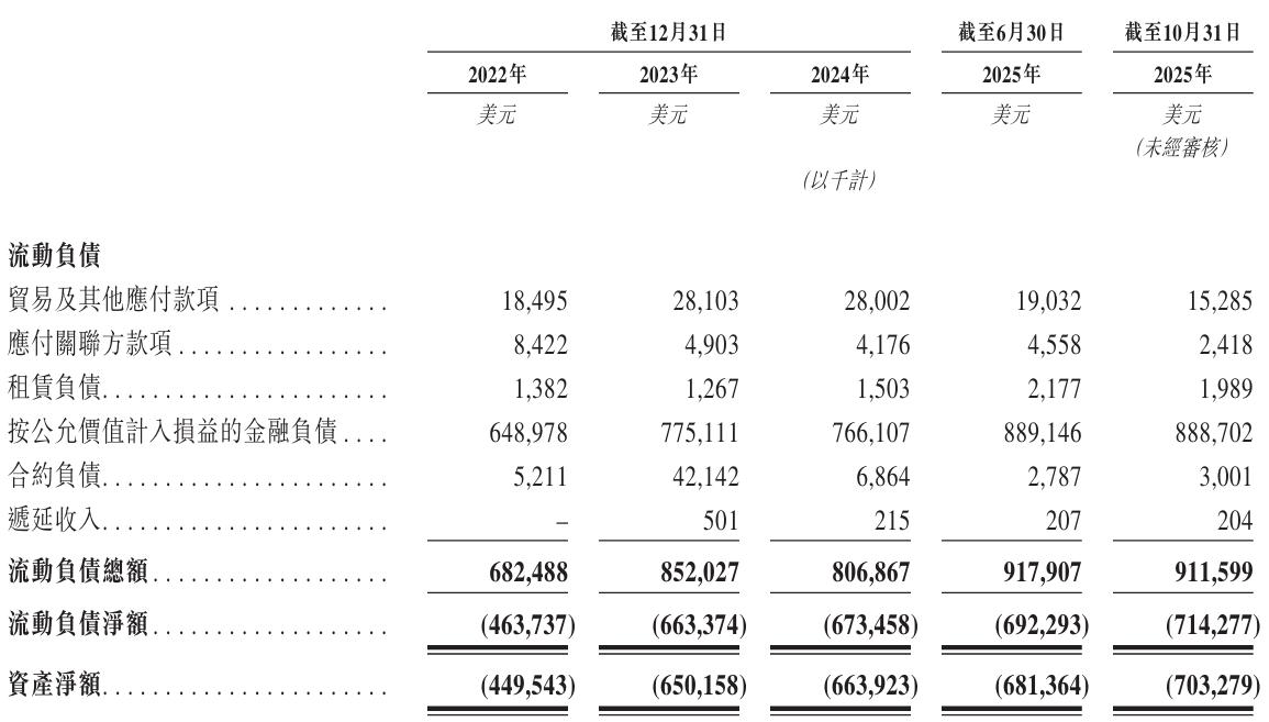 資產負債端的風險同樣不容忽視,截至報告期各期末英矽智能的負債凈額分別約為4.50億美元、6.50億美元、6.64億美元和6.81億美元,整體呈擴大趨勢;截至2025年10月末進一步來到7.03億美元,償債能力面臨挑戰。