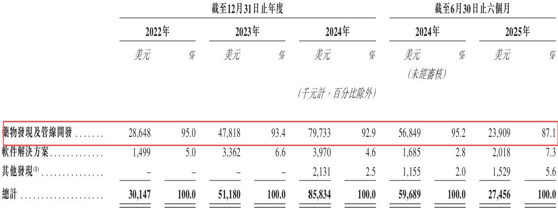 2025年上半年,英矽智能的第一大客戶易主,雖然“客戶E”1819.4萬美元的收入依舊占其同期總收入的66.3%,但失去Exelixis這一大收入來源直接導致該公司的藥物發現及管線開發收入同比下滑57.9%,進而影響其整體收入規模。