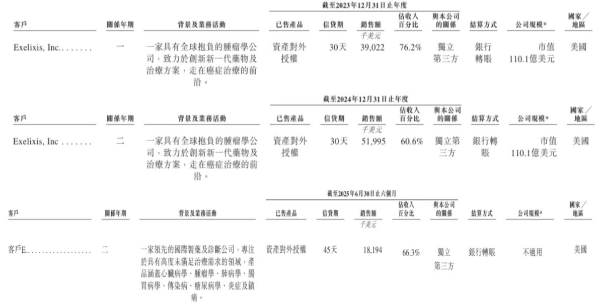 依賴少數授權的創收模式不僅令外界對英矽智能業績成長性產生了質疑,也影響了其客戶構成。2022年、2023年、2024年度和2025年上半年(即“報告期”),該公司前五大客戶的收入占比分別高達90.6%、94.1%、94.4%和86.2%。