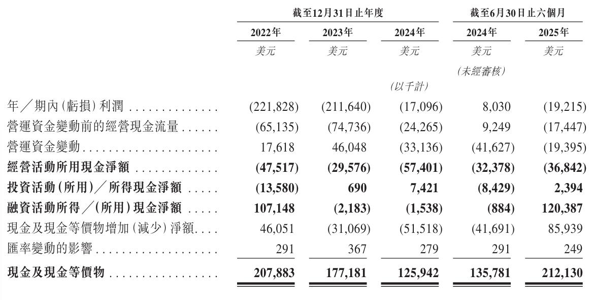 但由于持續虧損,英矽智能的經營活動所產生的現金凈額依舊處在告負的狀態,2022年、2023年、2024年度和2025年上半年分別錄得4751.7萬美元、2957.6萬美元、5740.1萬美元和3684.2萬美元的現金流出。