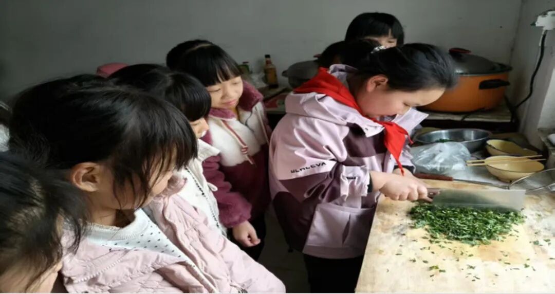 洗干凈的薺菜瀝干水分,孩子們圍在案板旁,目不轉睛地看著老師示范切菜動作。“左手輕輕按住菜,右手拿刀慢慢切,切成碎末就可以啦!”大家學得有模有樣,雖然有的切得粗粗細細不均勻,有的不小心把菜葉粘在了刀上,但每一個人都格外認真。菜刀“篤篤篤”的聲響里,嫩綠的薺菜碎末堆成了小山,清新的香氣越發濃郁。