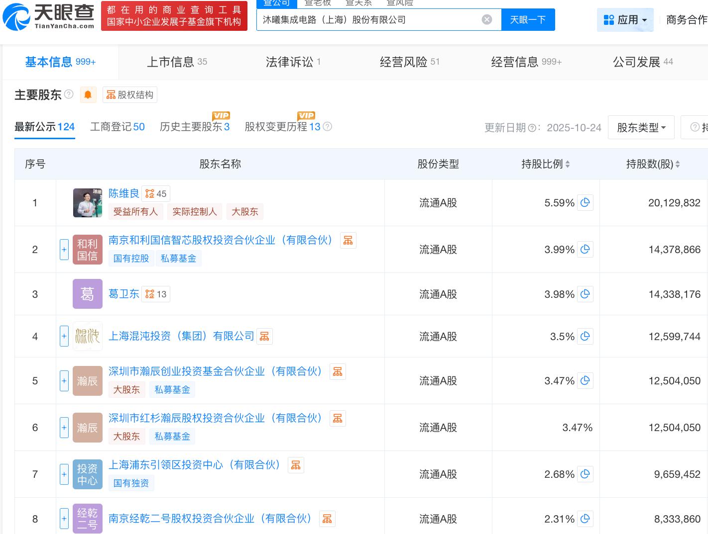 天眼查App信息顯示,沐曦股份成立于2020年9月,于2025年1月改制為股份有限公司。目前,該公司的注冊資本為3.6億元,法定代表人為陳維良,主要股東包括上海驕邁、陳維良等。