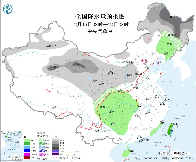 12月18日08時至19日08時,新疆北部和西部、內蒙古西北部和中東部、甘肅河西、青海北部、黑龍江、吉林中部、遼寧北部、河北北部等地部分地區有小到中雪或雨夾雪,其中,新疆沿天山地區和伊犁河谷、內蒙古東北部、甘肅河西、黑龍江西北部等地部分地區有大到暴雪(10~15毫米)。遼寧中部、四川東北部和南部、陜西西南部、云南中東部、貴州西南部、廣西西部、廣東東南部、福建東南部、海南島、臺灣島等地部分地區有小到中雨,局地有大雨(25~30毫米)。新疆東部、內蒙古中西部、青海南部、西藏北部、吉林中部、遼寧北部、山東半島等地部分地區有5~6級、陣風7~8級的大風,其中,新疆山口地區陣風可達8~10級。渤海、渤海海峽、黃海北部和東海南部部分海域將有7級、陣風8~9級的大風,臺灣海峽、巴士海峽、南海東北部和西南部部分海域將有7~8級、陣風9~10級的大風。