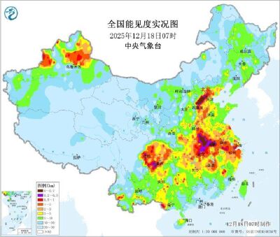 18日至19日,華北中南部、黃淮、江淮西部、江漢、陜西關中、四川盆地等地的部分地區大氣擴散條件較差,有輕至中度霾,部分地區有重度霾。其中夜間至上午時段,上述部分地區伴有大霧天氣,其中四川盆地、華北中部和黃淮西部的部分地區有濃霧,局地有強濃霧。預計,12月18日早晨至上午,河北中部、河南東南部、安徽中部、湖北東部、浙江北部、四川盆地中南部等地的部分地區有大霧,其中,河北中部、河南南部、安徽中部、湖北東部、四川盆地東南部等地的部分地區有能見度低于500米的濃霧,河北中部、河南南部、安徽中部、四川盆地東南部等地局地有能見度低于200米的強濃霧。中央氣象臺于12月18日06時繼續發布大霧黃色預警。