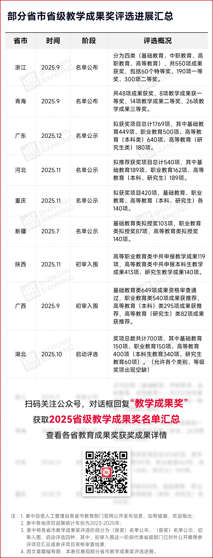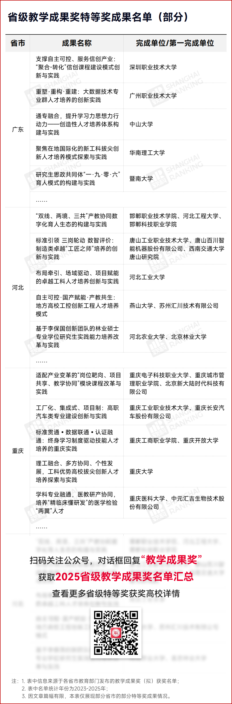 關注【軟科職教】公眾號,對話框回復“教學成果獎”,獲取《2025各省市省級教學成果獎名單匯總》,查看沖刺國家級教學成果獎潛力名單。