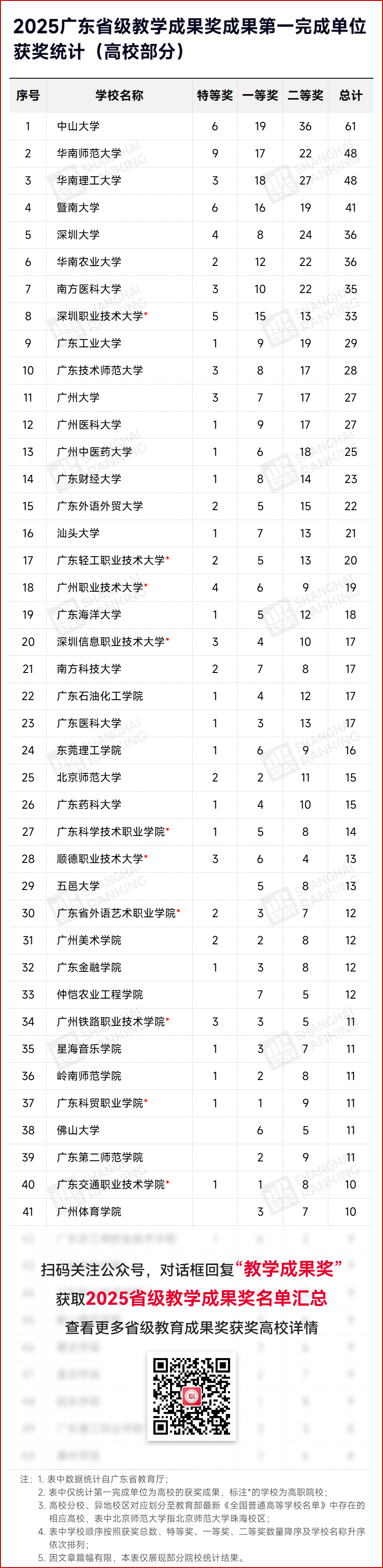 以廣東省為例,2025年廣東省級教學成果獎分為基礎教育、職業(yè)教育、高等教育(本科類)和高等教育(研究生類)。12月15日,廣東省教育廳發(fā)布《關于2025年全省學校優(yōu)秀教學成果獎(職業(yè)教育)擬獲獎名單的公示》,至此省內(nèi)4類教學成果獎獲獎名單全部出爐。