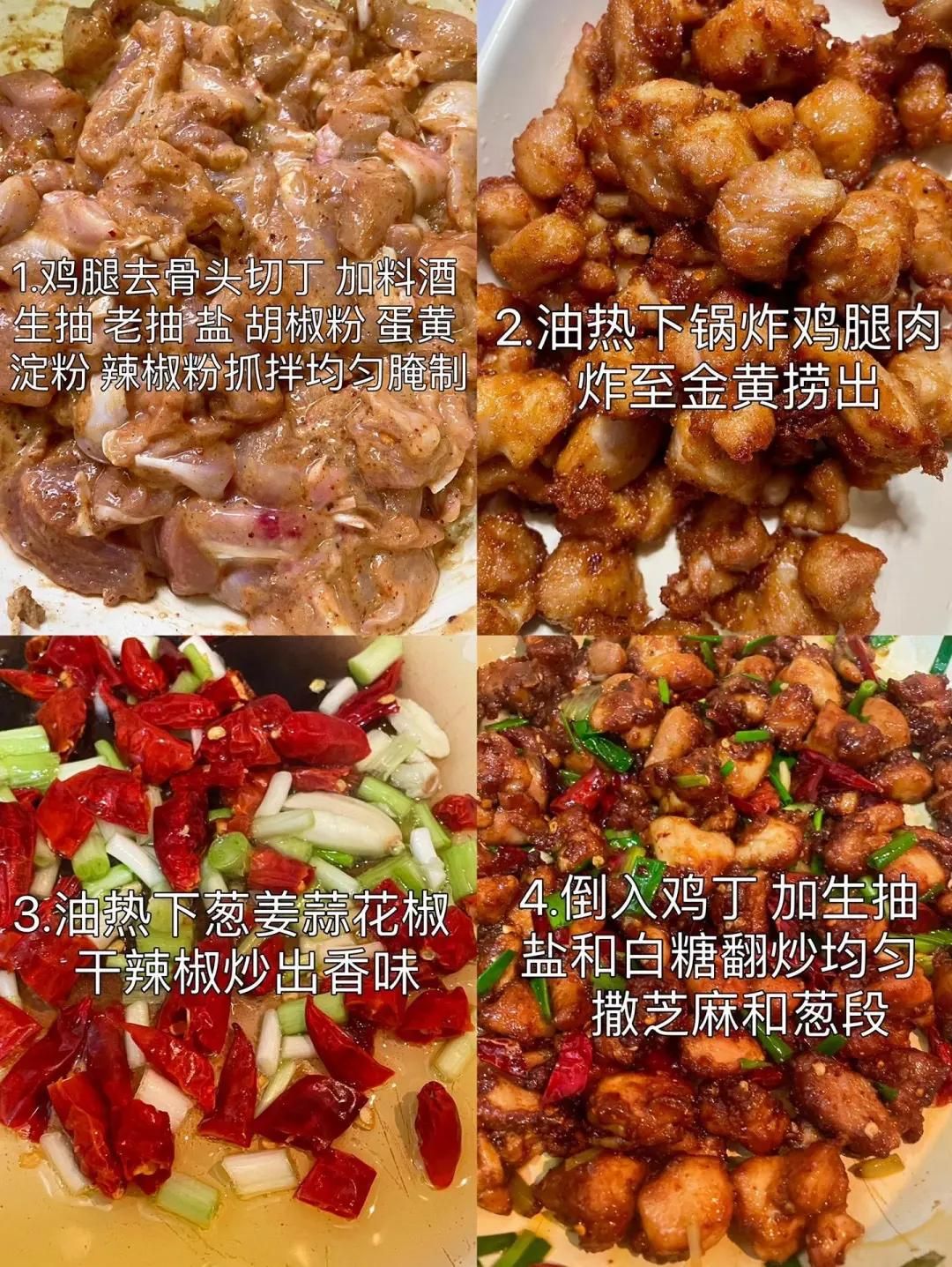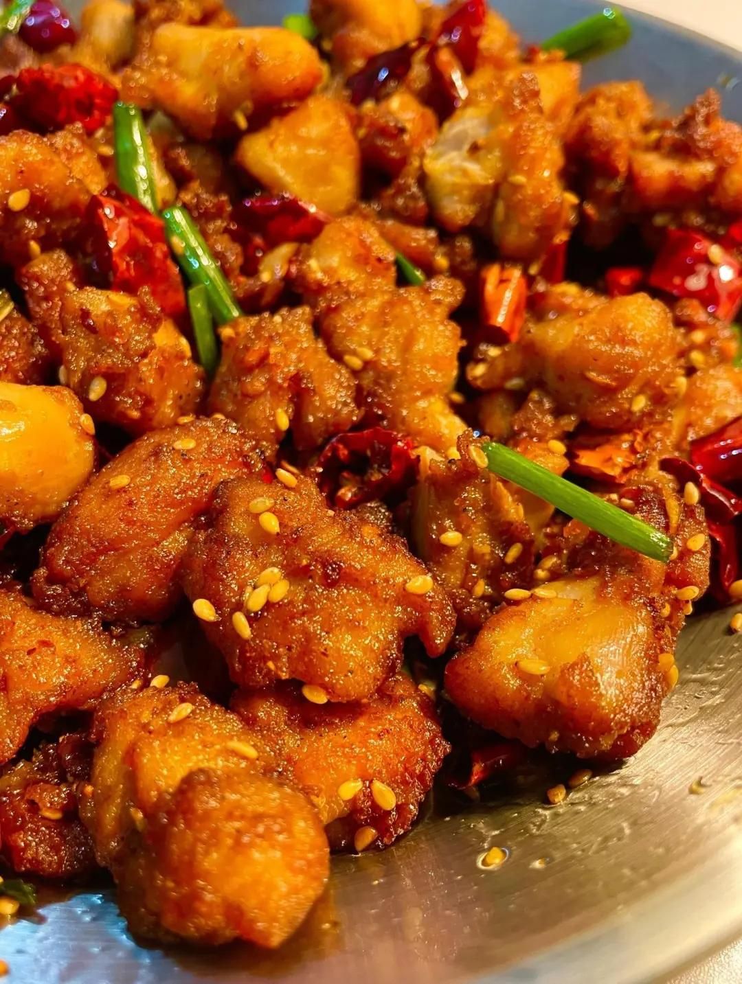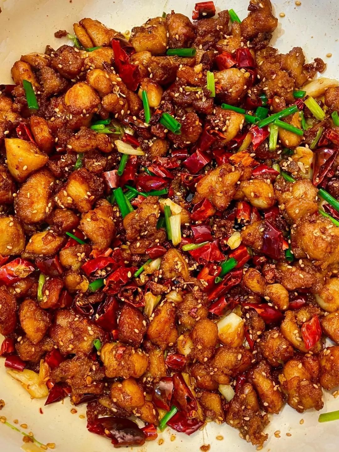 鍋里留少許底油,放入姜片、蒜片、花椒和干辣椒段爆香,接著放入炸好的雞肉塊,大火快速翻炒兩分鐘,加一勺孜然粉和少許鹽調(diào)味,最后撒上蔥段翻炒均勻即可出鍋。