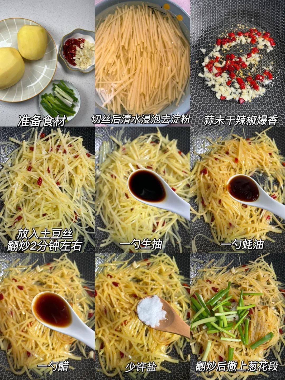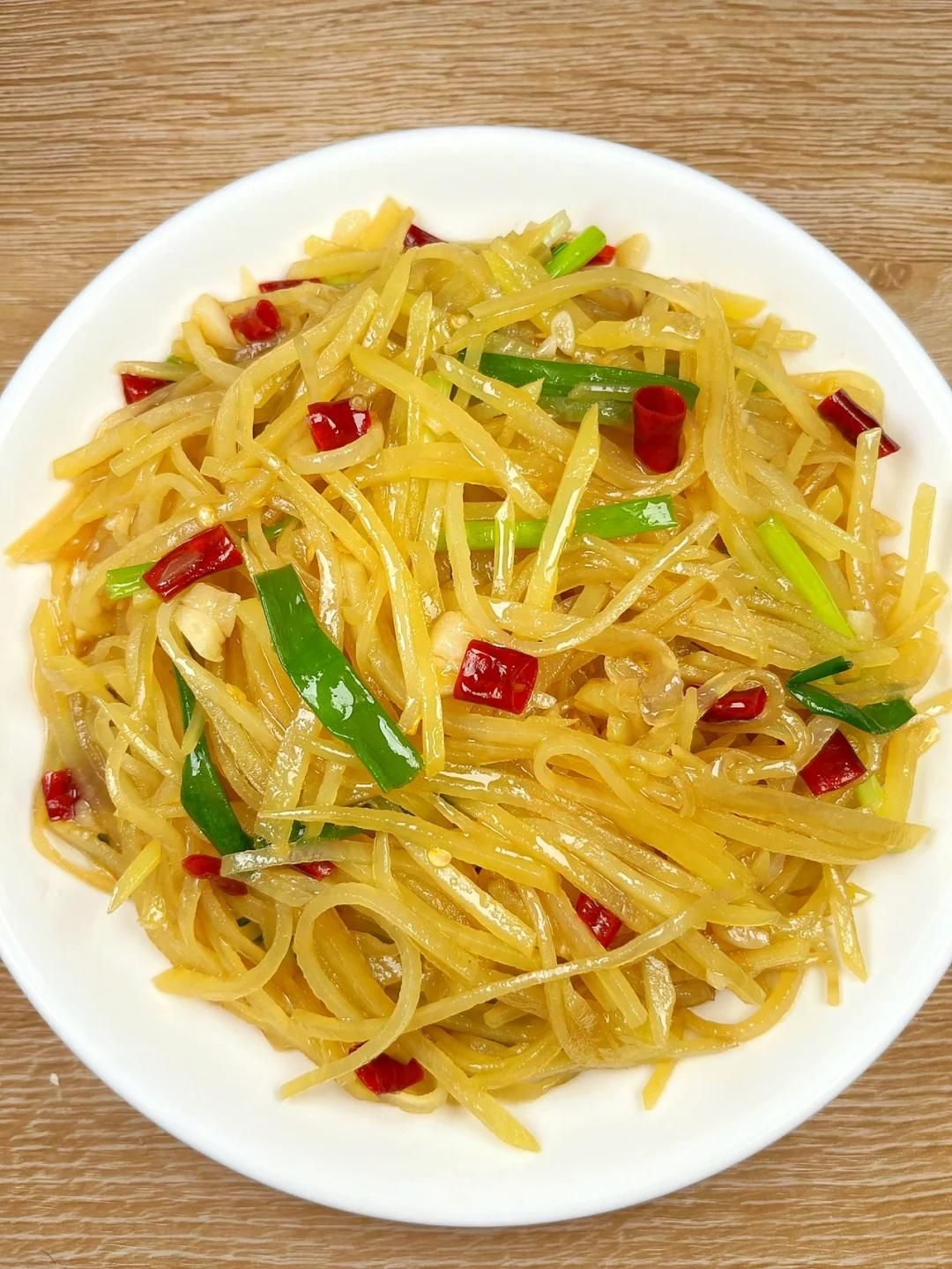 加一勺醋、一勺生抽和少許鹽調(diào)味,繼續(xù)翻炒至土豆絲斷生,最后撒上蔥花即可出鍋。