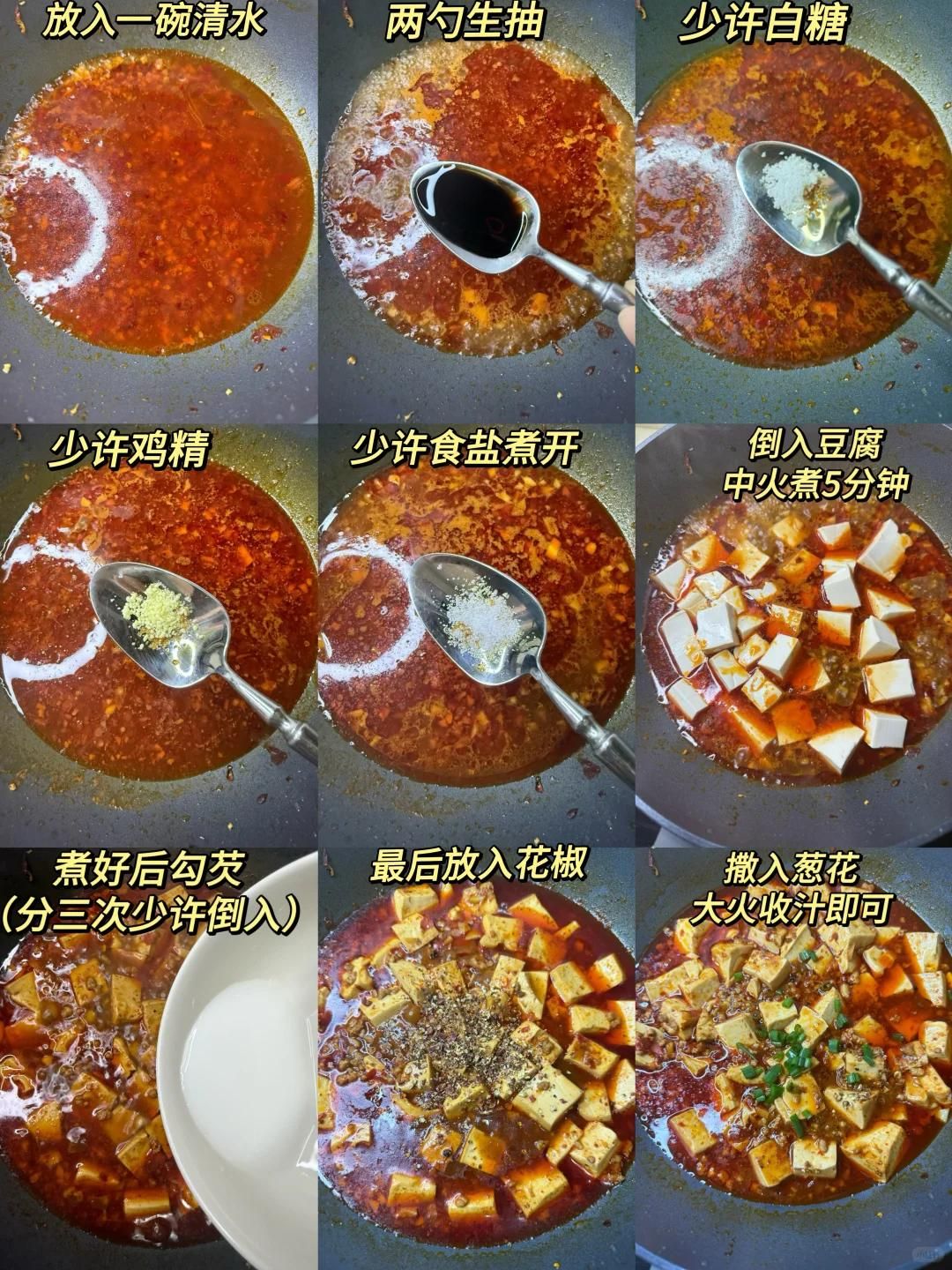 然后倒入適量清水,加一勺生抽、半勺老抽調(diào)味,大火燒開后放入焯好的豆腐塊,輕輕推動(dòng)湯汁讓豆腐均勻入味。