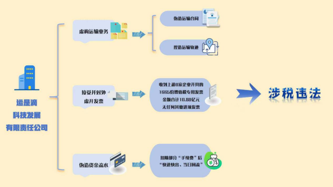 經(jīng)查,運是滴科技發(fā)展有限責(zé)任公司檢查期內(nèi)累計接受上游16家公司虛開增值稅專用發(fā)票2028份,價稅合計13.04億元;向下游379家公司虛開增值稅專用發(fā)票4411份,價稅合計18.55億元。