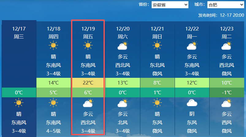 19日,全省晴天轉多云。20日,西部、南部陰天,有小雨或零星小雨,其中高海拔山區有雨夾雪或小雪;其他縣(市、區)多云間陰天。19日到20日白天,全省偏北風或西北風3到4級,中西部陣風6到7級。