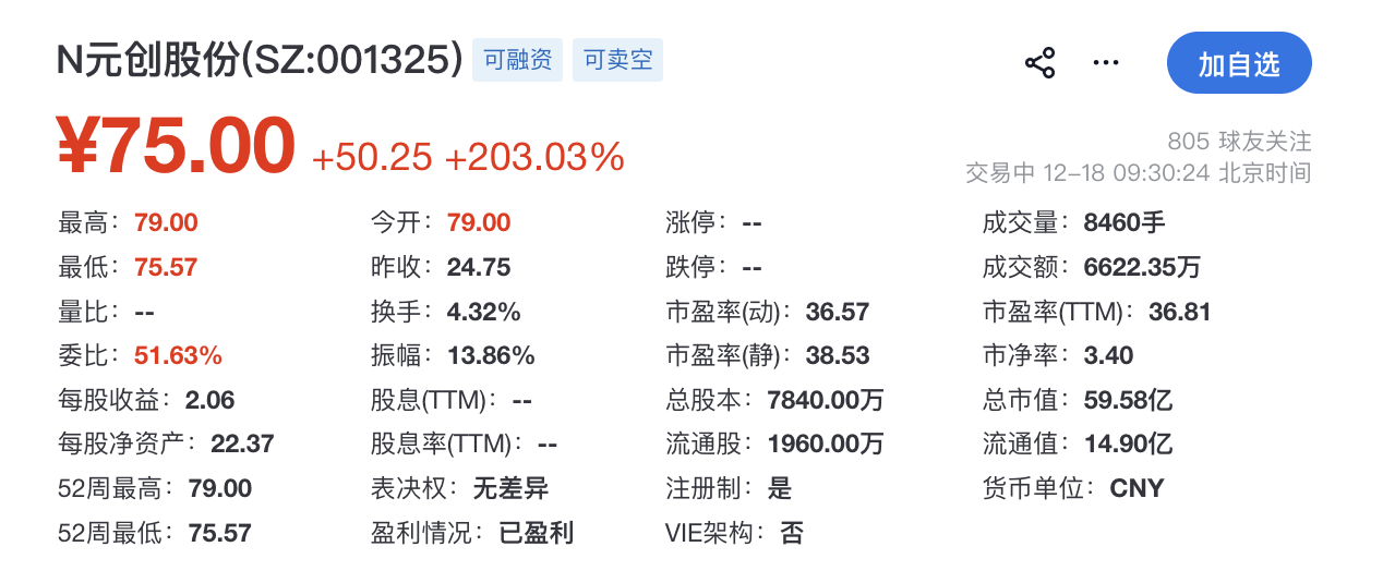 瑞財經 劉治穎 12月18日,N元創股份(001325.SZ)在深交所主板掛牌上市,保薦機構為國泰海通,開盤漲203.03%,總市值59.58億元。