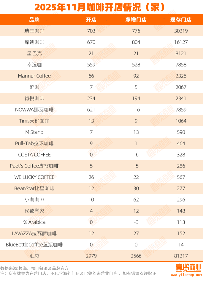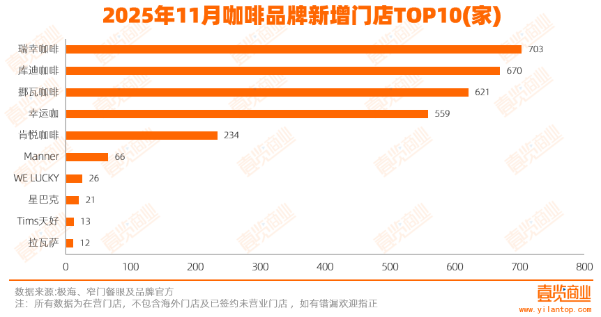 其中,瑞幸咖啡單月新增801家,占比超過四分之一,成為當月拓店主力;庫迪咖啡和挪瓦咖啡緊隨其后,分別新增670家和621家;幸運咖新增559家,肯悅咖啡新增234家。