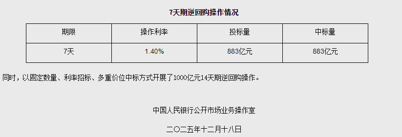 中新網12月18日電 據央行網站消息,2025年12月18日,中國人民銀行以固定利率、數量招標方式開展了883億元7天期逆回購操作。