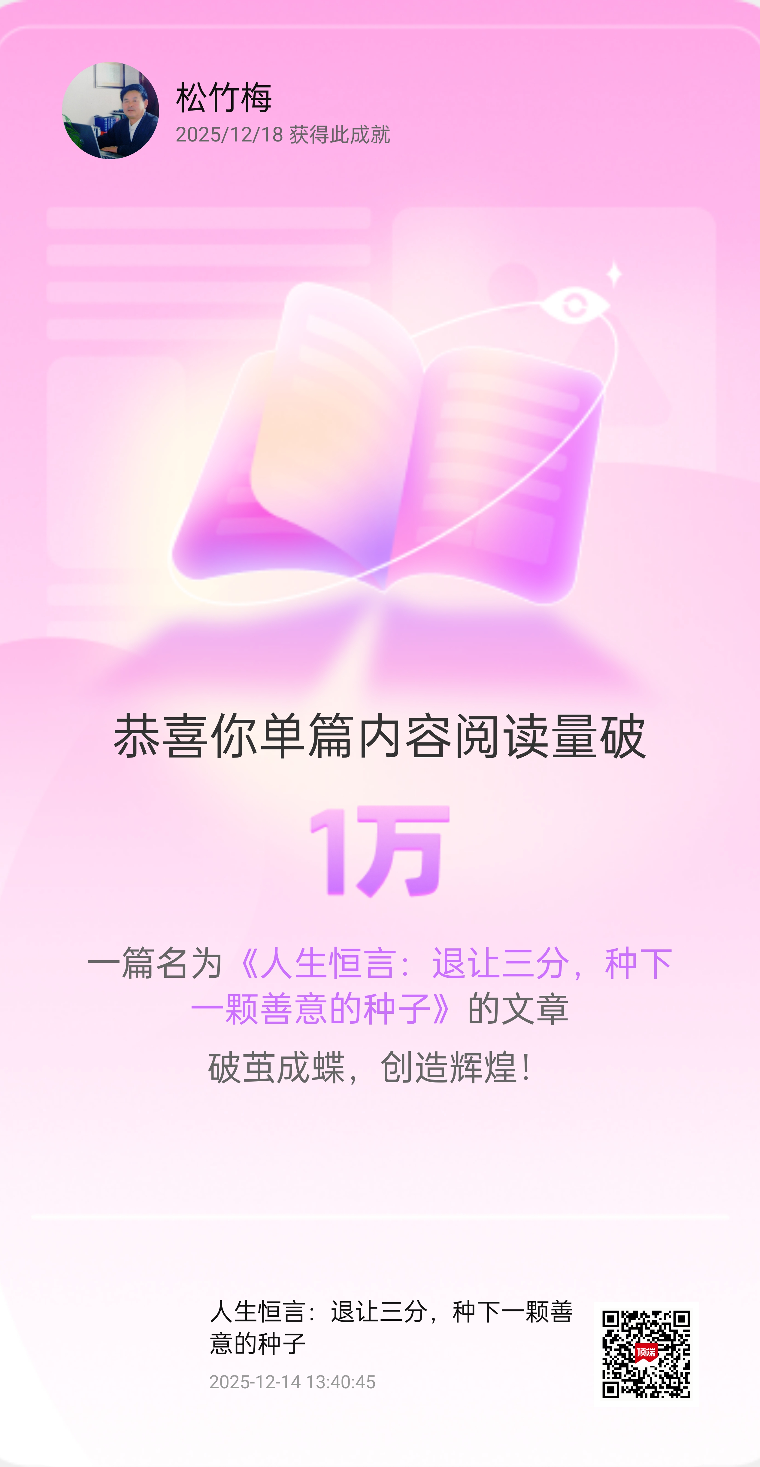 我的拙作《退讓三分,種下一顆善意的種子》單篇閱讀量突破一萬。