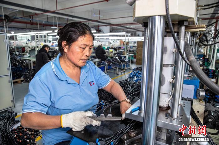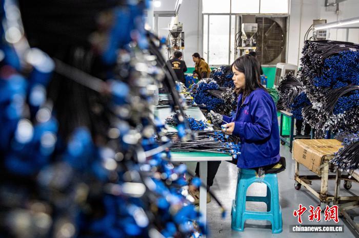 圖為工人在金沙縣經(jīng)濟(jì)開發(fā)區(qū)一家數(shù)據(jù)線生產(chǎn)企業(yè)車間生產(chǎn)線上作業(yè)。史開心 攝