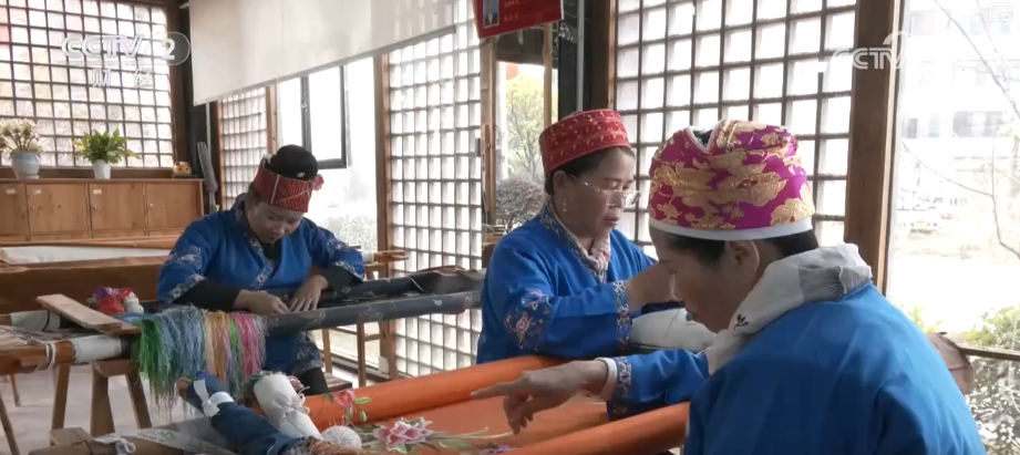 隔壁的繡娘工作室,繡娘們正坐在繡架前,給機繡作品做最后的點睛之筆。
