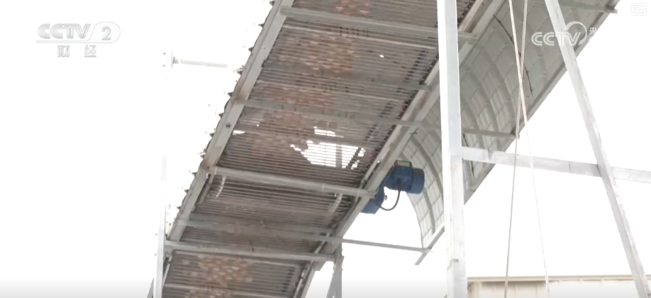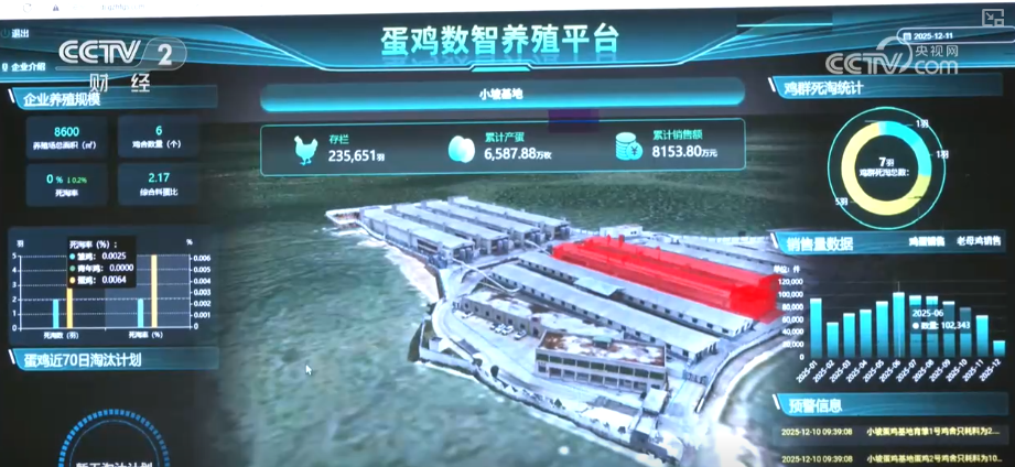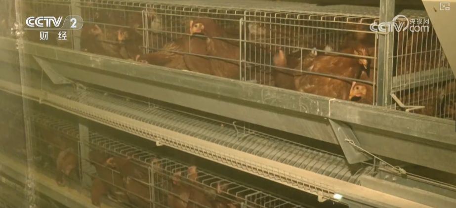 這個雞舍里大約有78000只蛋雞,這一個雞舍日產蛋最多可以達到77000多枚,在雞籠外置的白色傳輸帶上正在往蛋庫傳送雞蛋。工作人員介紹,這里只需要一位養殖人員管理,雞舍里安裝了傳感設備和控制設備,采集到的數據經過數據大模型分析后,實現養殖環境的精準控制。