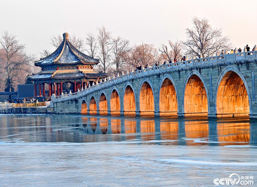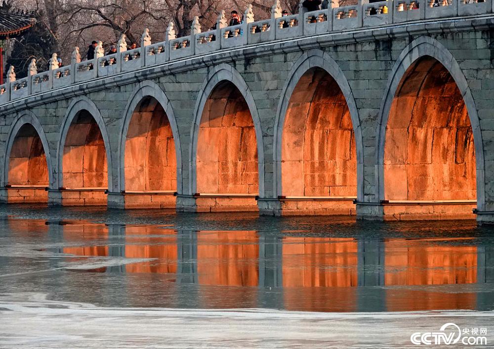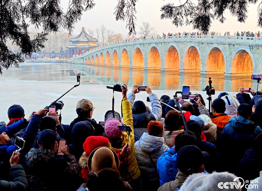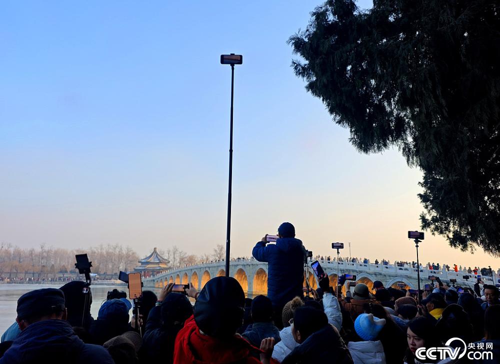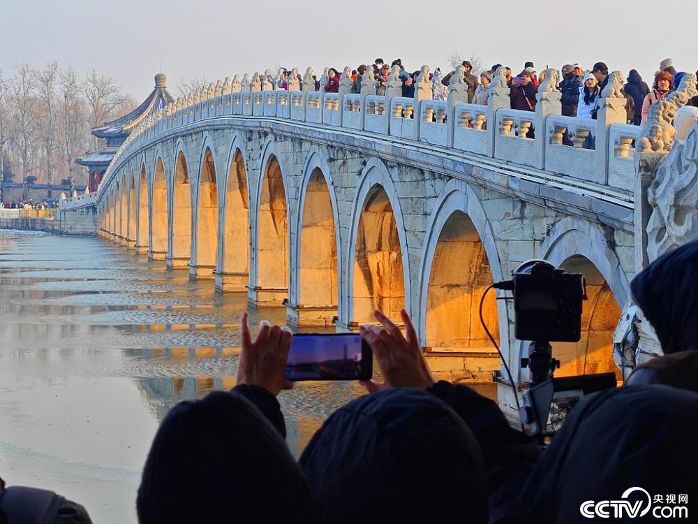 2025年12月17日,冬至將至,北京天氣晴好,頤和園十七孔橋“金光穿洞”迎最佳觀賞期,日落時分,市民游客紛紛舉起各種手機、相機,記錄這油畫般的美好時光。視覺中國
