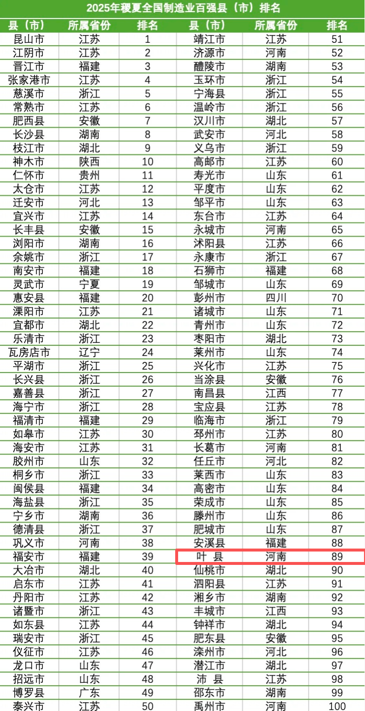 12月17日,中國(guó)經(jīng)濟(jì)新聞網(wǎng)、鳳凰網(wǎng)、華夏時(shí)報(bào)網(wǎng)、今日頭條、千龍網(wǎng)五大媒體同步發(fā)布2025年全國(guó)制造業(yè)百?gòu)?qiáng)縣(市)榜單,葉縣再次上榜,居第89位,較2024年上升2個(gè)位次。我縣連續(xù)4年獲評(píng)全國(guó)制造業(yè)百?gòu)?qiáng)縣,從最初的第98位上升到目前的第89位。河南省共上榜6個(gè)縣市,葉縣名列第五,是平頂山唯一上榜縣(市)。